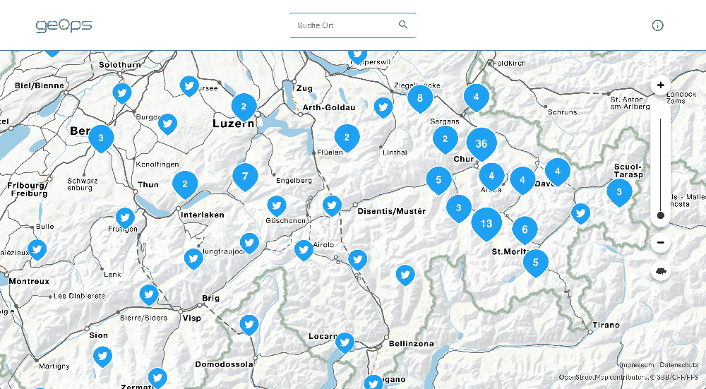 Das zweite große Projekt, womit ich mich gegen Ende meiner Praktikumszeit beschäftigen durfte, war Railview. Railview zeigt die Orte, an denen Fabio, ein leidenschaftlicher Lokführer der Rhätischen Bahn, die Fotos geschossen hat, die er in seinem Twitter-Account @calandamountain veröffentlicht.