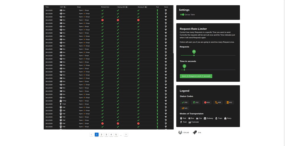 Wir haben ein einfaches, ansprechendes User Interface bereitgestellt, das alle Routing-Ergebnisse in einer Tabelle darstellt. Man kann durch Symbole sehen, ob die Anfrage zum Anfragezeitpunkt erfolgreich war oder nicht. Das Hilfreiche an diesem Tool ist, dass es die Möglichkeit gibt, die Anfragen erneut durch die Routing API zu jagen, um einen Vergleich zu schaffen. Alle Anfragen können eingesehen werden, wodurch man die Antwort der jeweiligen Anfrage sehen kann.